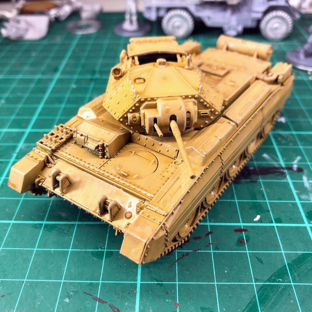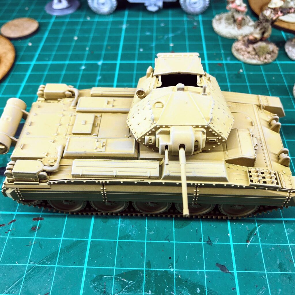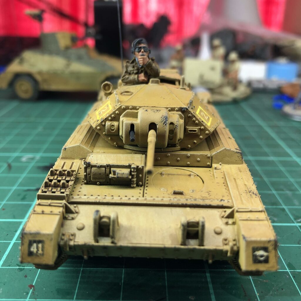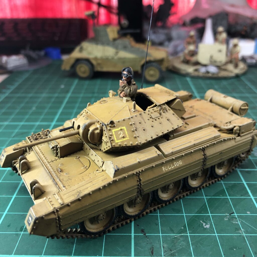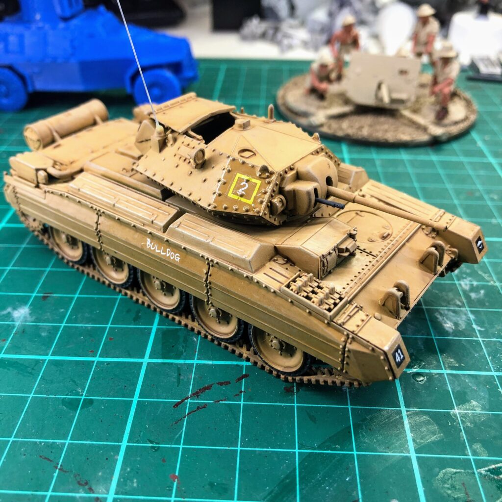 Finished my A15 Crusader, named “Bulldog”, of 2 Troop, B Squadron, 9th Australian Division Cavalry Regiment. The 9th Division AIF arrived in the Middle East with Vickers MkVI light tanks and Universal Carriers; their first actions were fighting the Vichy French, from which they captured and used some Renault R35 tanks, and then the Italians, using captured M13/40s and other Italian tanks. As German armour became stronger, they were rearmed with British Crusader cruiser tanks and M3 Stuarts.