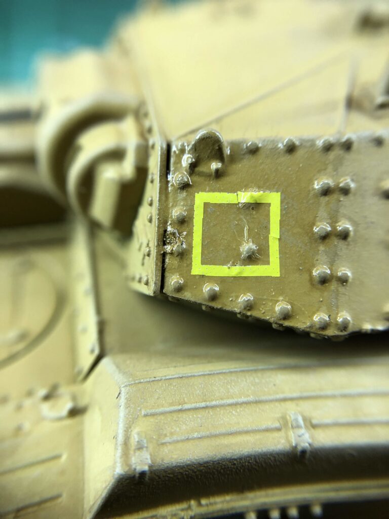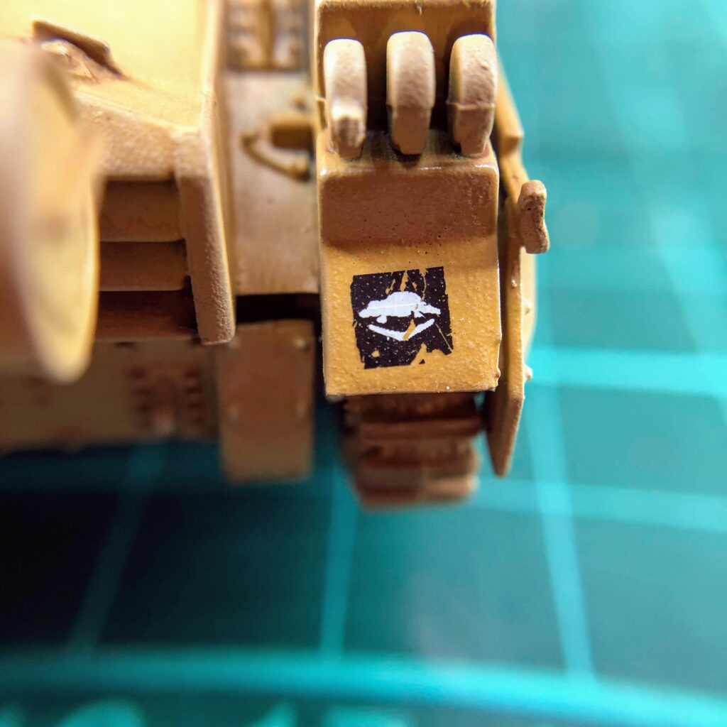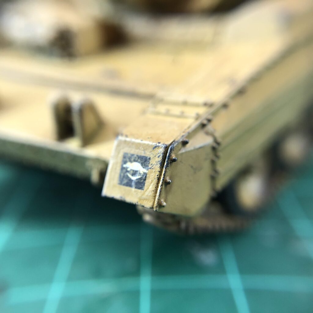 After assembly I primed with Army Painter Desert Yellow spray, then drybrushed with Army Painter Skeleton Bone. This was followed by an allover wash with Army Painter Soft Tone. With relevant sections of armour gloss coated by brush with Humbrol Gloss Cote, I applied decals; no pictures exist of Crusaders with 9th Australian Division identifiers however I based my application both on British tanks and this excellent guide to Australian Matilda tank markings.